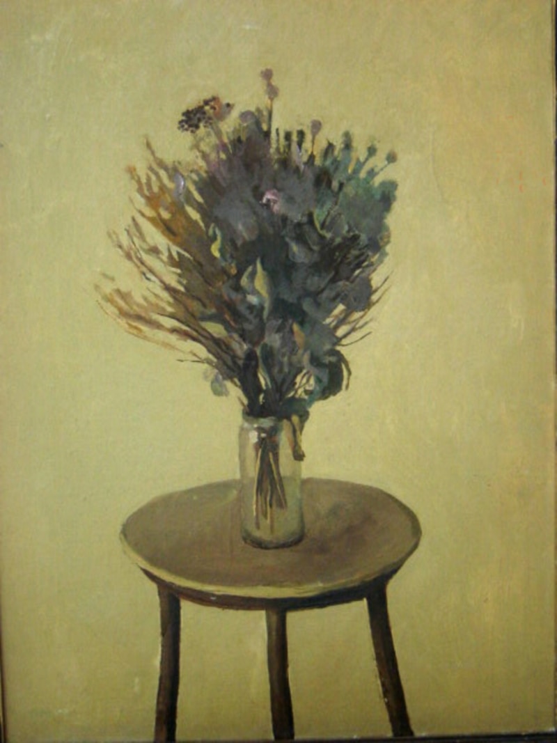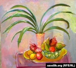 “Қуриган гуллар” 1986 йил. Мато, мойбўëқ. Бу асар илк марта 1988 йилда Тошкентдаги Илҳом кўргазмалар залида намойиш қилинган. Бу расм ҳам Москвадаги Суриков институти бадиий устахонасида таниқли рассом Тоҳир Салахов раҳбарлигида яратилган.