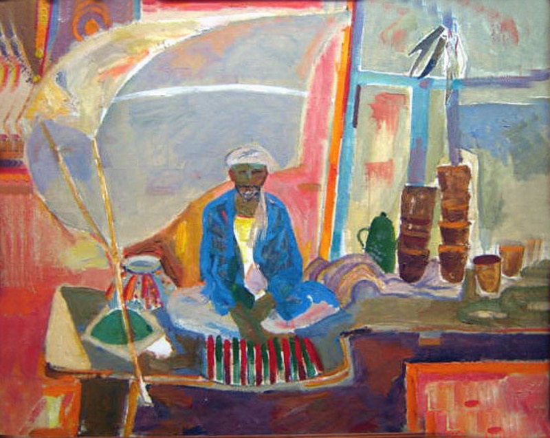 “Носфуруш” 1985 йил. Мато, мойбўëқ. Бу асарда рассом Француз символистлари йўлидан бориб¸ шарқ бозорларидаги реал тасвирдан декоратив кўриниш яратади. Асар “Туркистон авангарди” деб аталган йўналишга ҳам уйғун. Асар Москвадаги устахонада яратилган. “Оила” 1985 йил. Мато, мойбўëқ. Бу асар ҳам рассомнинг Москва даврига мансуб бўлиб, символизм йўналишида яратилган. Асар катта монументал панно учун эскиз деб ҳам тақдим қилинган. 1985 йилда Москвадаги Ўзбекистон ваколатхонаси янги биноси қурилганида, ўша бинони безаш учун конкурс эълон қилинганида, бу эскиз ҳам иштирок қилган, аммо қабул қилинмаган.