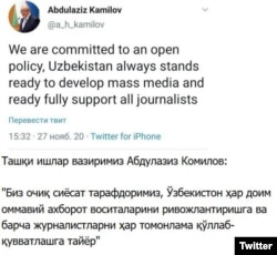 Етакчи Ғарб давлатлари элчиларининг Ўзбекистондаги сўз эркинлигини ҳимоя қилувчи твитлари билан бир вақтда Twitterдаги @a_h_kamilov акаунтида қуйидаги пост пайдо бўлди.