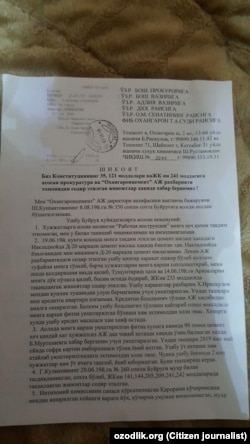 ОҲАНГАРОН. “Мен – Б.Рисқулов, Тошкент вилояти Оҳангарон шаҳридан ёзмоқдаман. “Оҳангаронцемент” АЖ раҳбарининг жорий йил 8 августдаги буйруғига кўра ишдан бўшатилдим. Раҳбариятнинг қарорини ноқонуний деб биламан. Тафсилотларга тўхталмоқчи эмасман. Аммо шуни қисқача маълум қиламанки, раҳбариятнинг қинғир иши фош бўлиб қолди ва улар ҳужжатларни сохталаштириб барча айбни менга тўнкаб ишдан бўшатишди. Мутасаддилардан вазиятни холис ўрганиб, мени қайта ишга тиклашлари, ноқонуний ушлаб қолинган маблағни қайтаришлари ва “Оҳангаронцемент” АЖдаги айбдор масъулларга чора кўришларини сўрайман”.